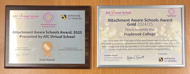 We are delighted to share that Haybrook College has been awarded the Gold Attachment Aware Schools Award (July 2025), recognising our commitment to developing a whole-college understanding of attachment and trauma-informed practice.
